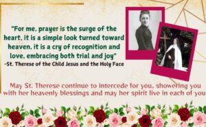 So, let’s imitate our Blessed Mother and St. Thérèse by saying, “yes” to God every day: by humbly and quietly accepting annoyances and difficulties, by seeking—and loving people who are difficult to be around, and by giving ourselves to others through small acts of charity. And, over the course of years, we will discover the secret to peace, joy, and love.